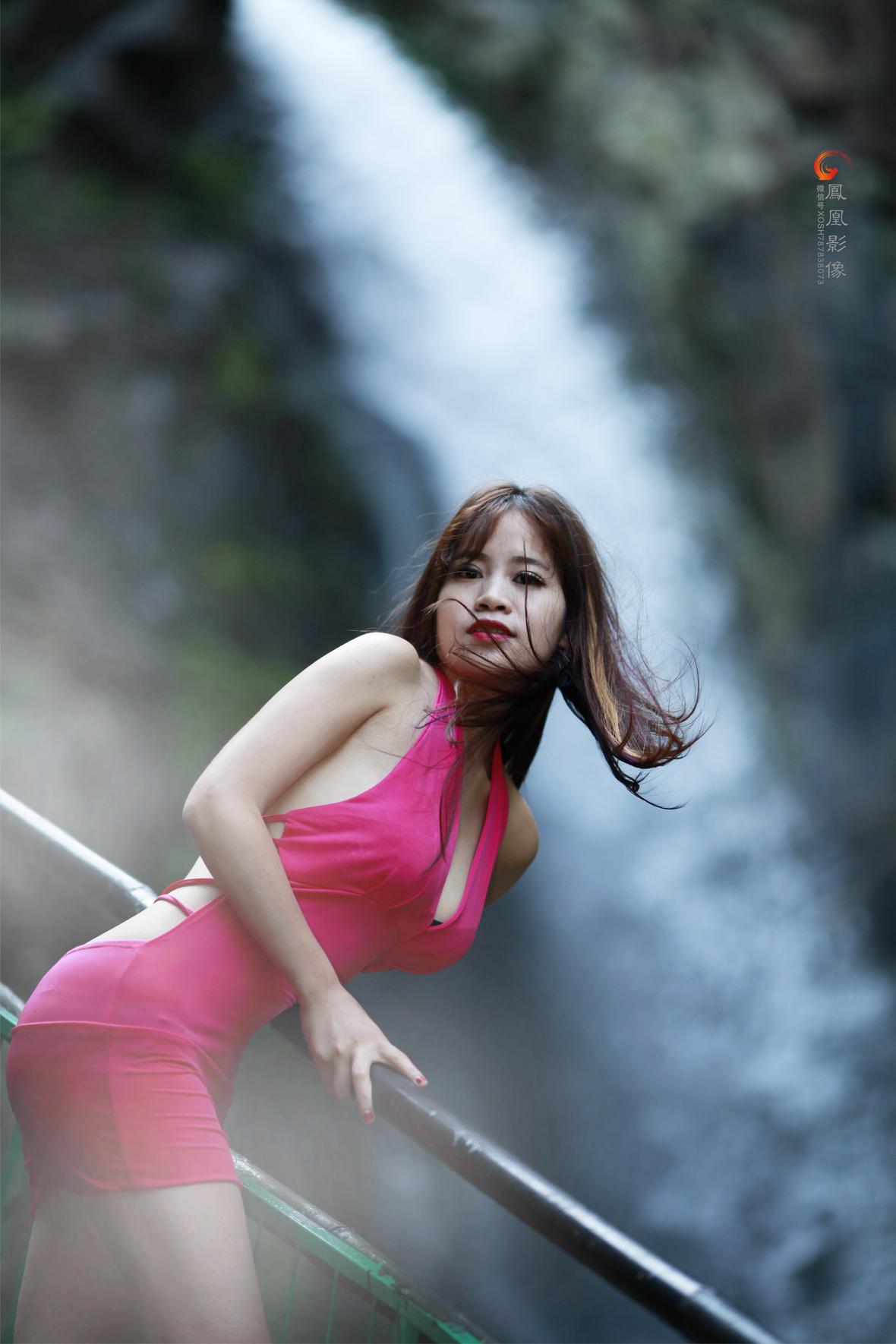 静观,瀑布与美女,自然与时尚,神奇的混搭。瀑布般的长发、玫红色比基尼,,跟那原始的岩石的黄、飘逸的瀑布的白、淳朴的栏杆的绿,竟是那么和谐!一种大自然的柔媚,令人对大自然造化的肃然起敬……