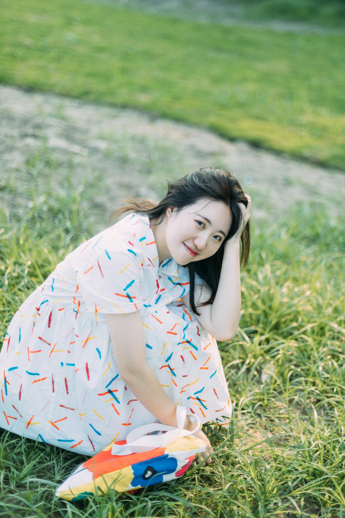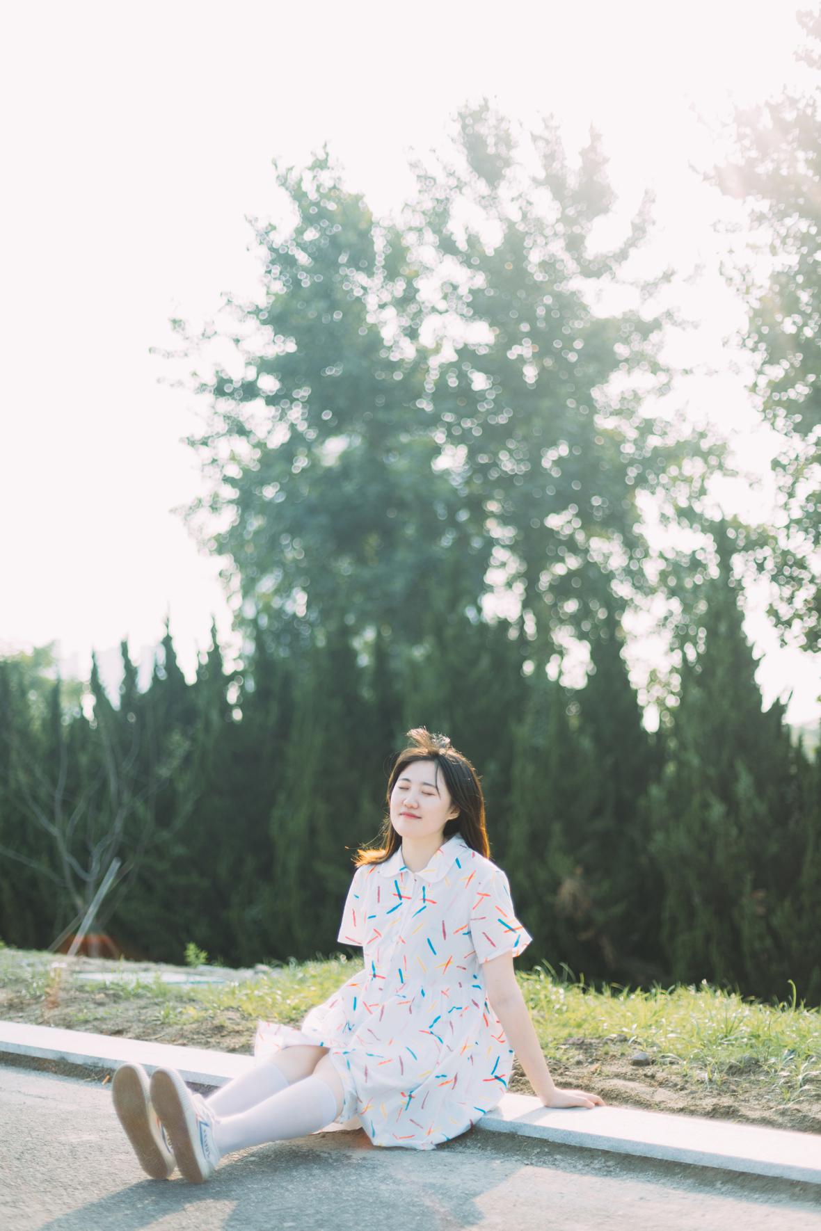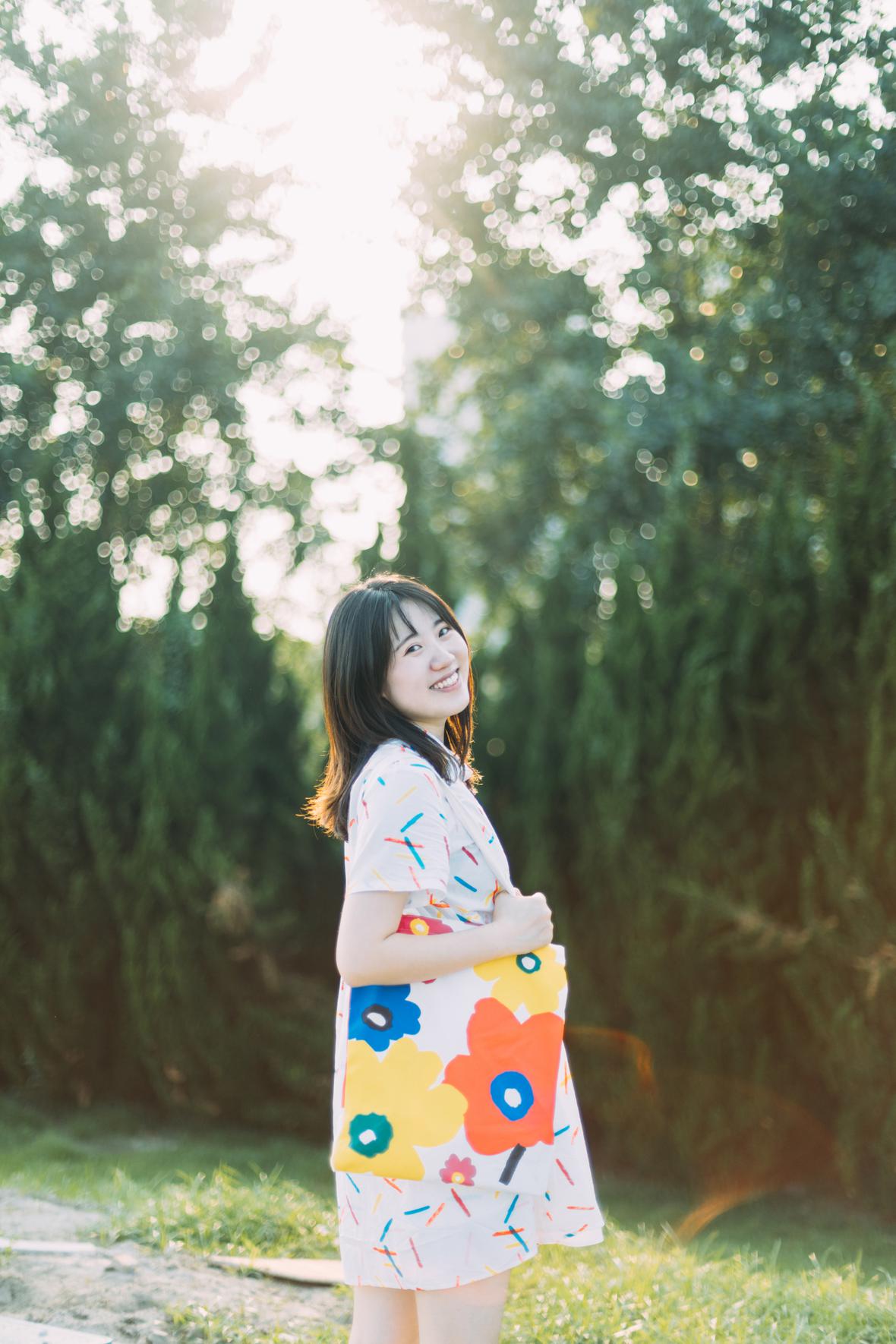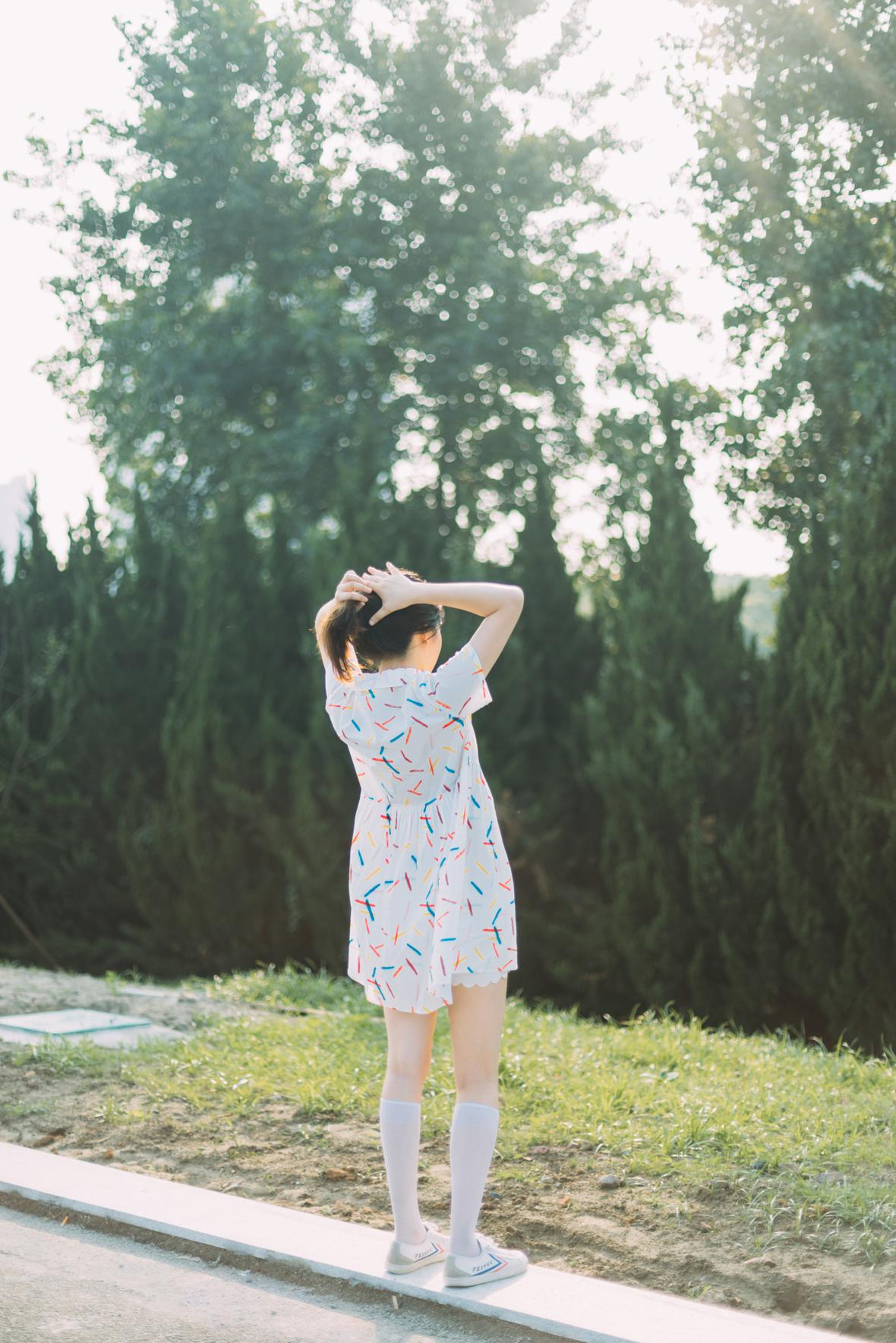在阳光下,穿花裙子,跑来跑去。