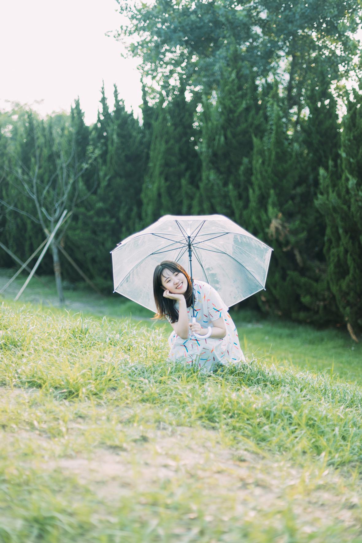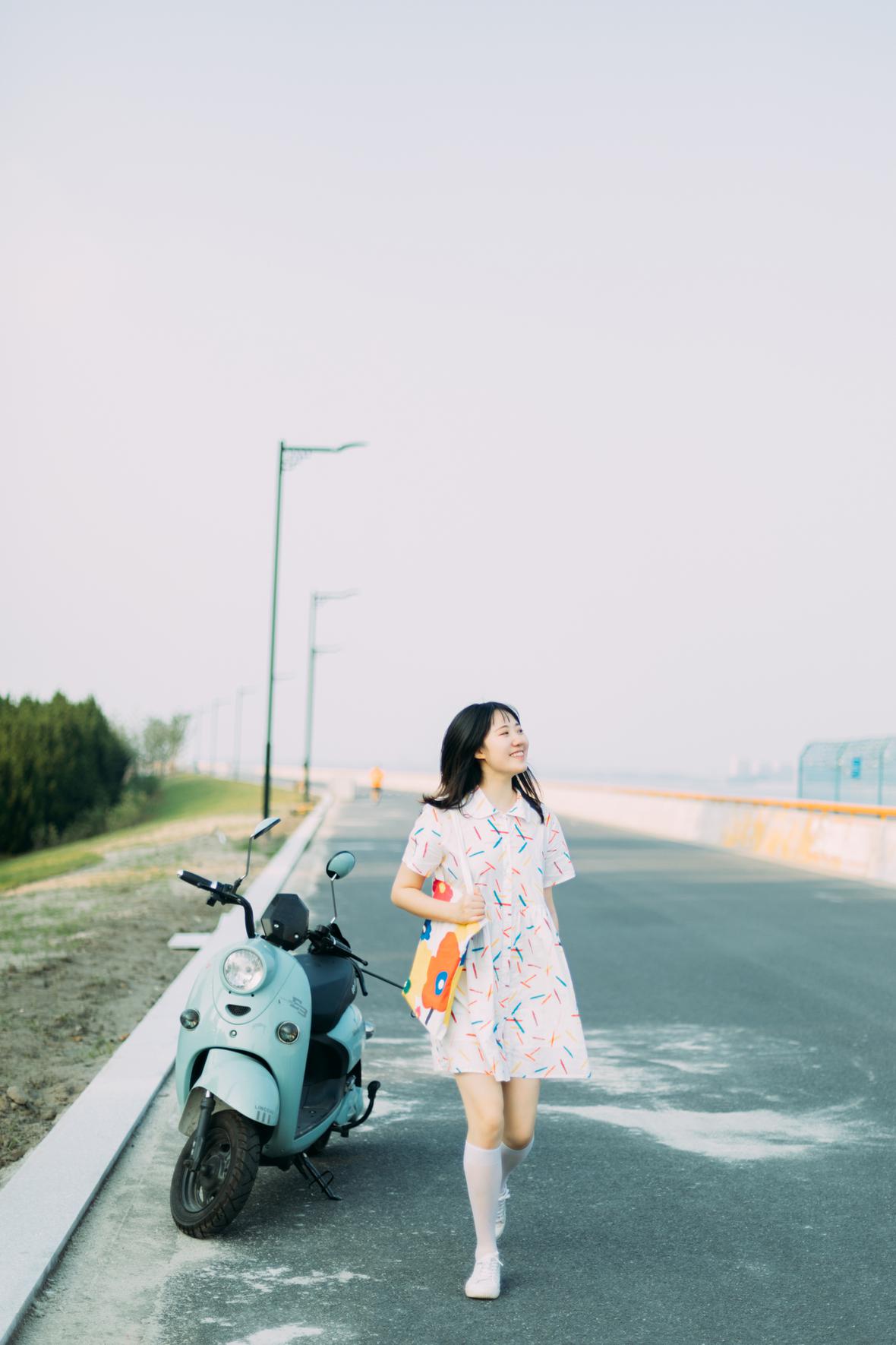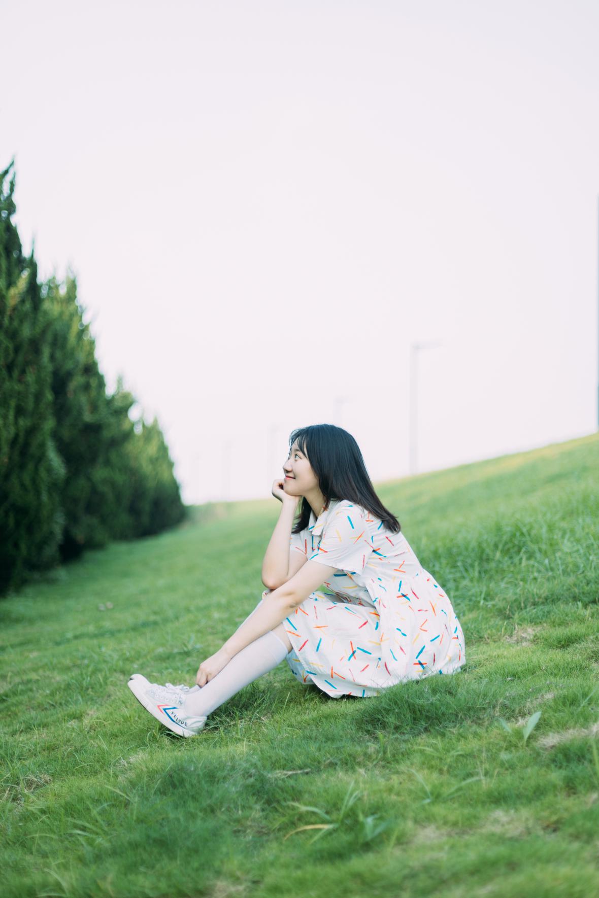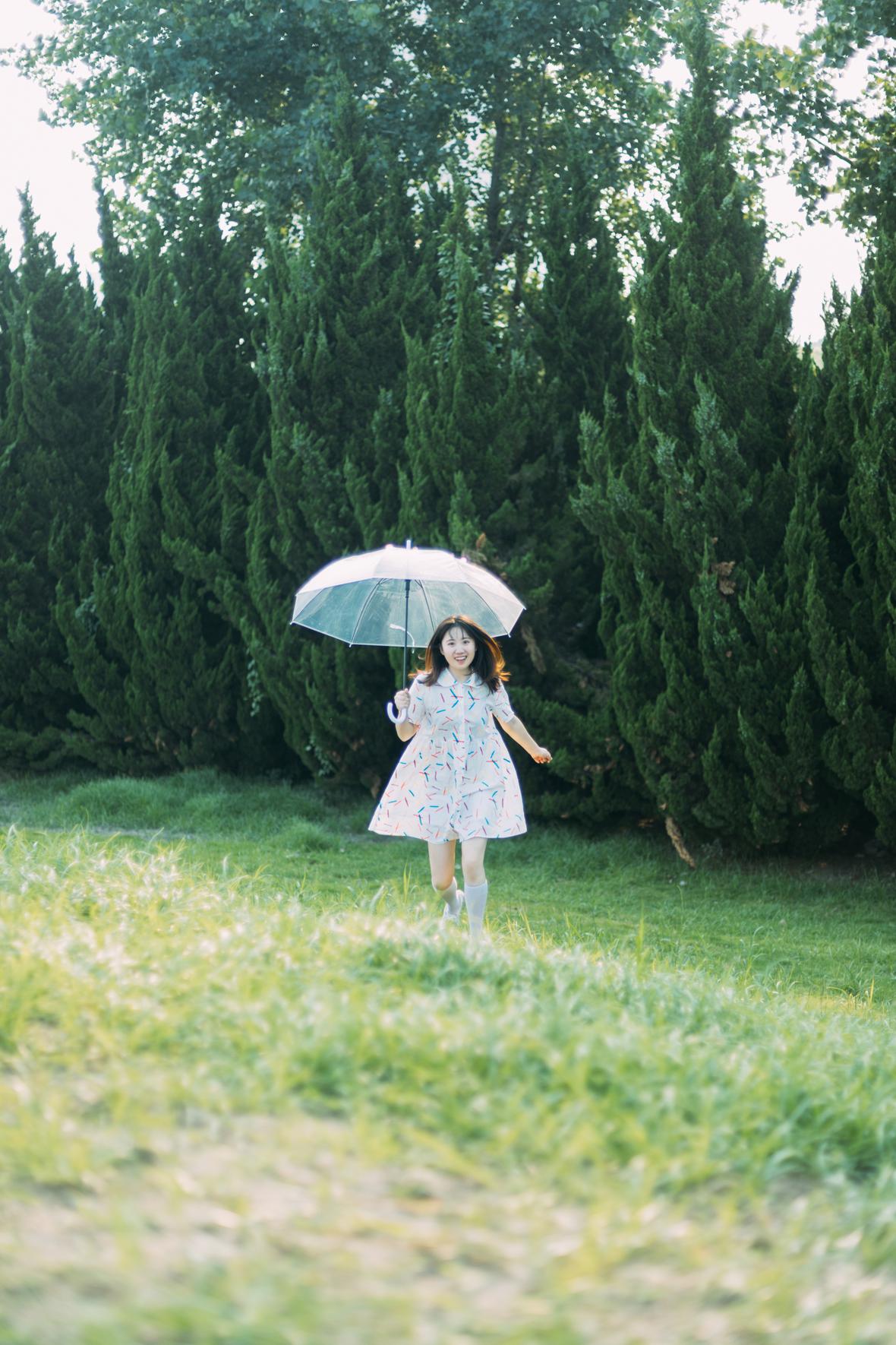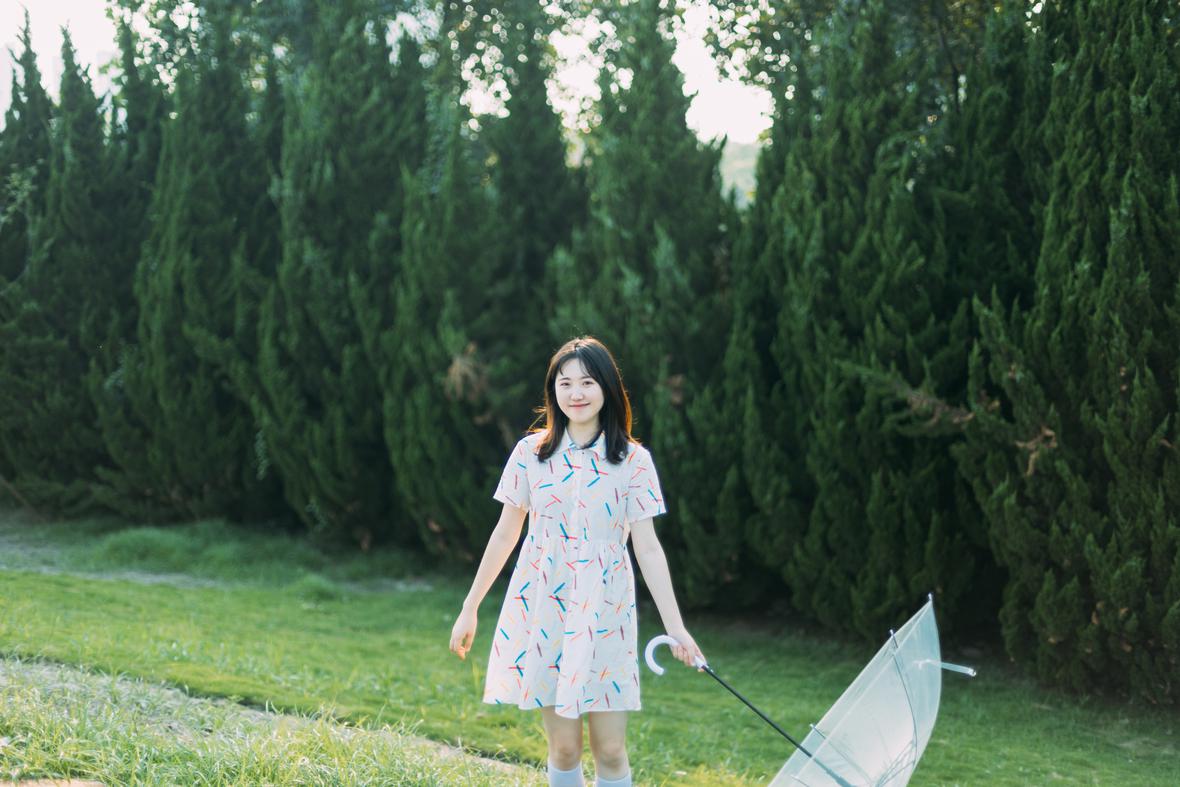 在阳光下,穿花裙子,跑来跑去。