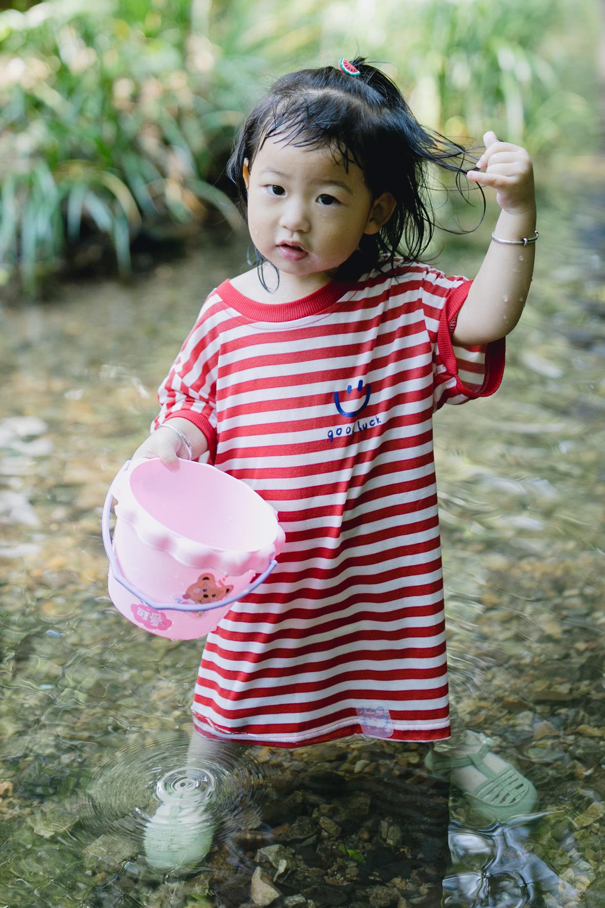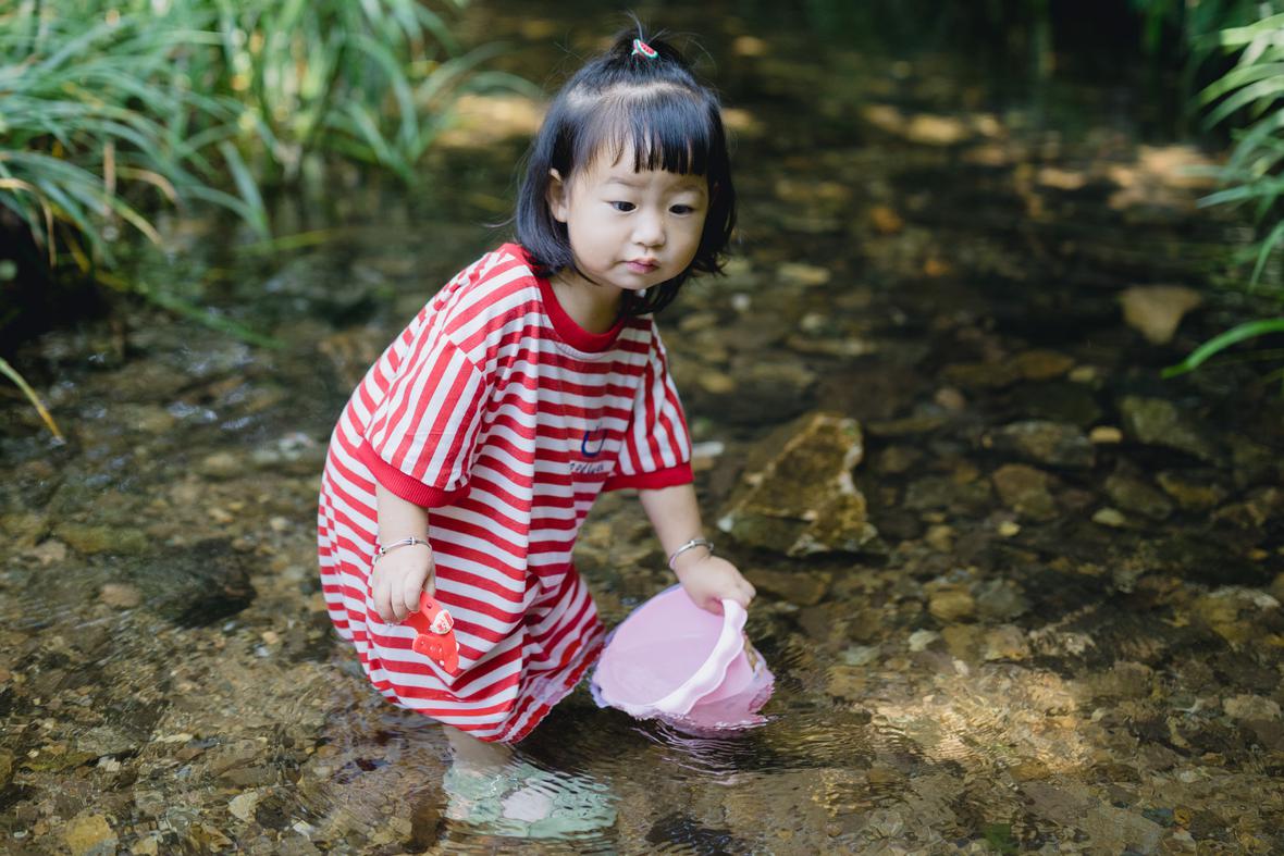 对于菲比而言,这是她第一次体验九溪的快乐。仅一只粉色小桶,就让她乐不可支。22个月的她会说“还要玩”“没有鱼”“冰冰凉”“呦呦切克闹”,以及会将打满水的水桶递给新认识的小男孩说“哥哥帮我拿拿”,小奶音,超好玩。