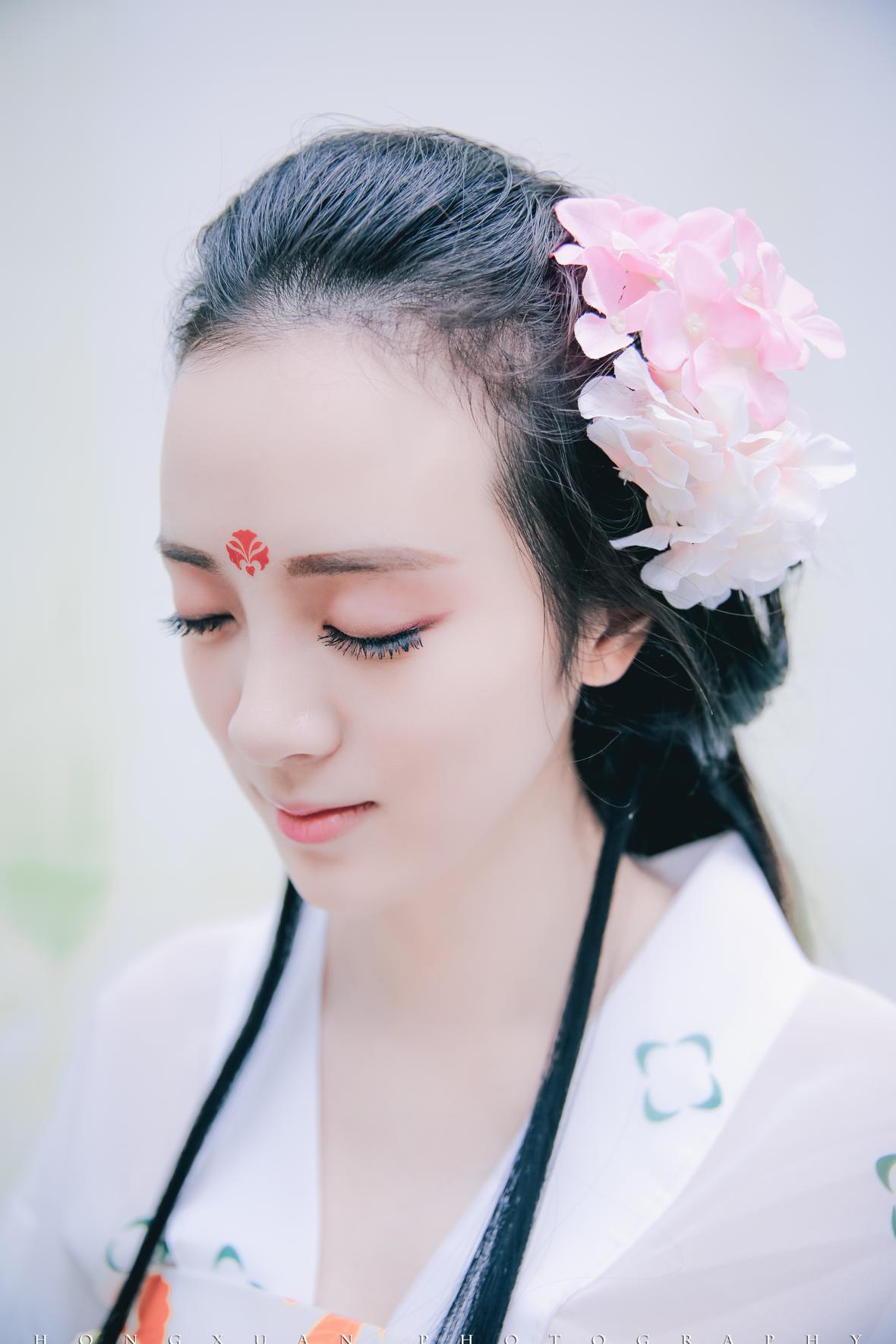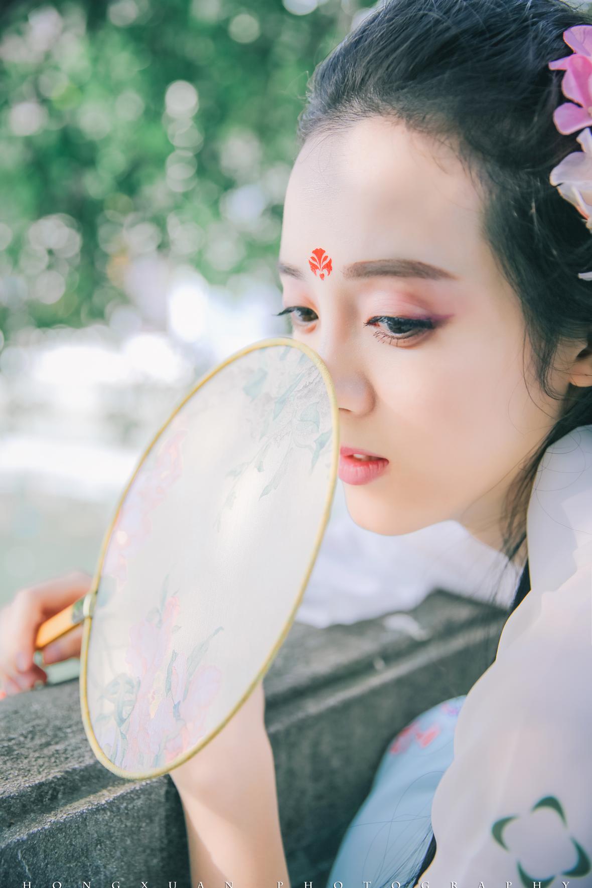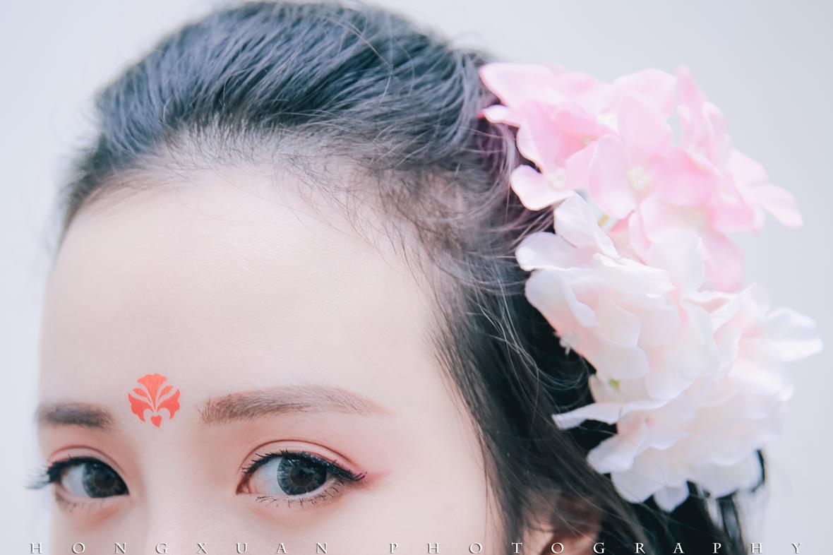打点好,两人直奔植物园,我在园里给她粘那眉间的纹,她低头的模样,人比花娇。