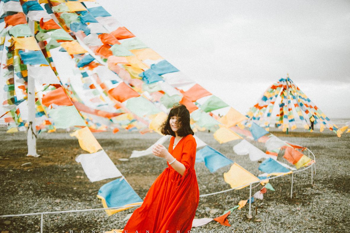 当天到茶卡时已经六点多,花花穿着红裙子,被呼啦呼啦的风吹得似乎要飘走了。