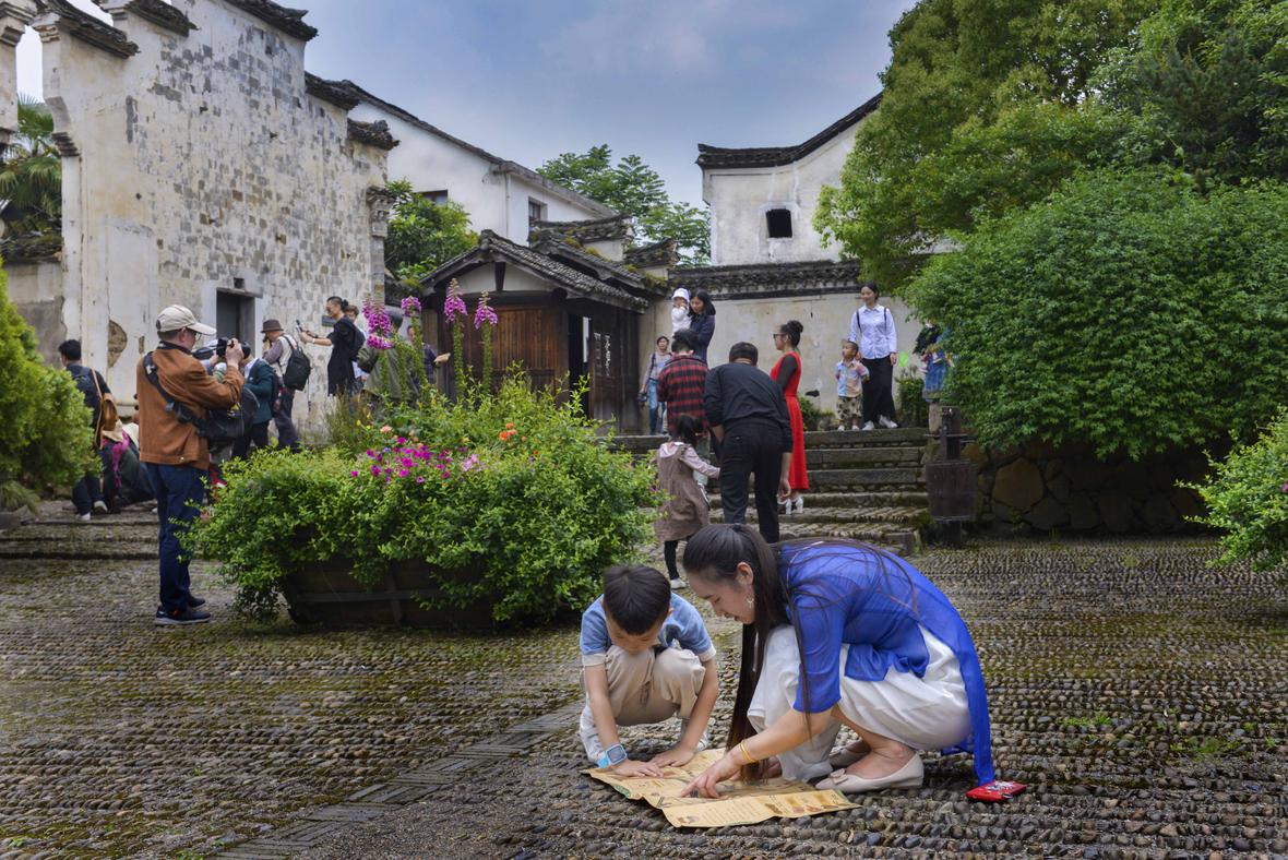 龙门古镇,一位妈妈现场教儿子学会看地图