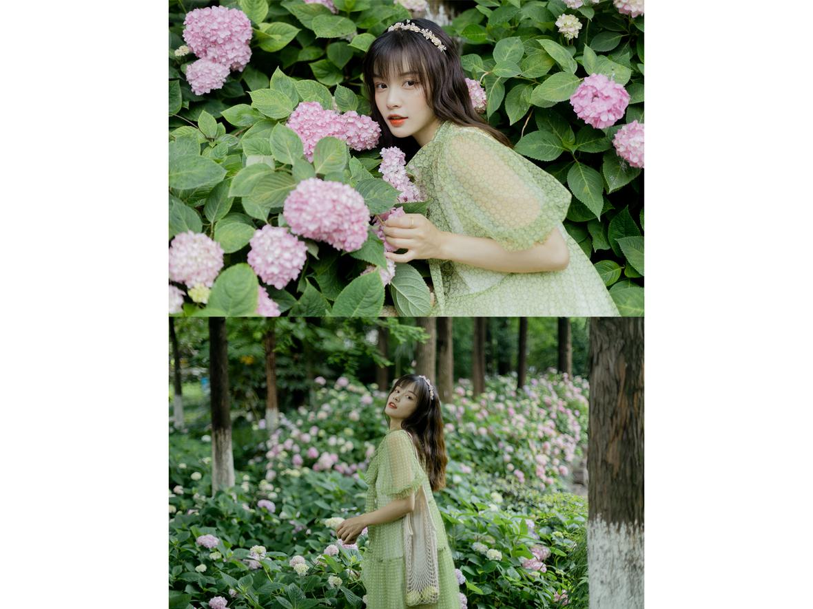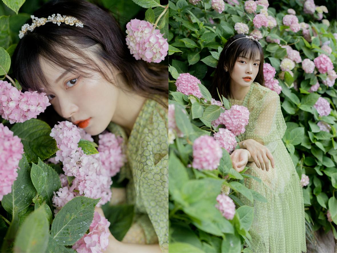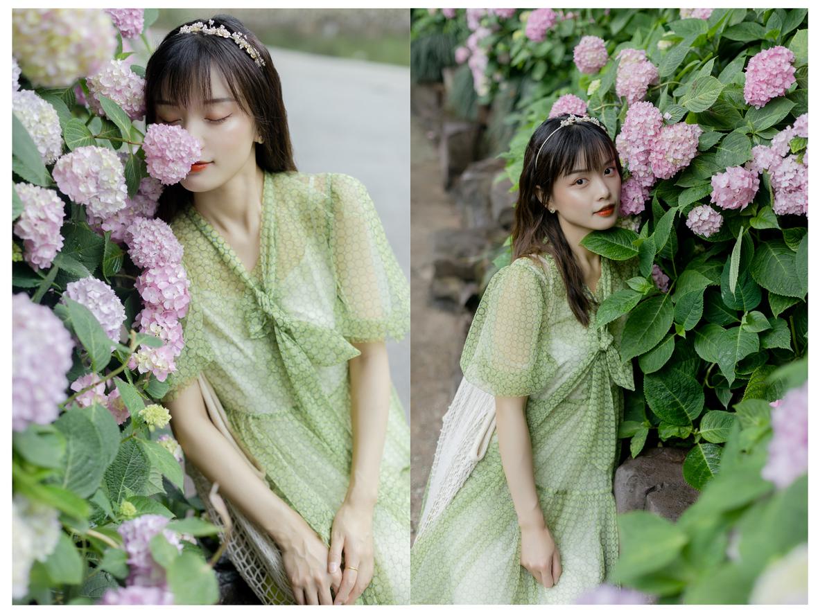 记得那天,小溪冒雨来找我,我们俩丝毫不顾细雨迷蒙,在绣球花初绽的城东公园拍照,她裙袂飞扬,站在花丛间,样子很好看。