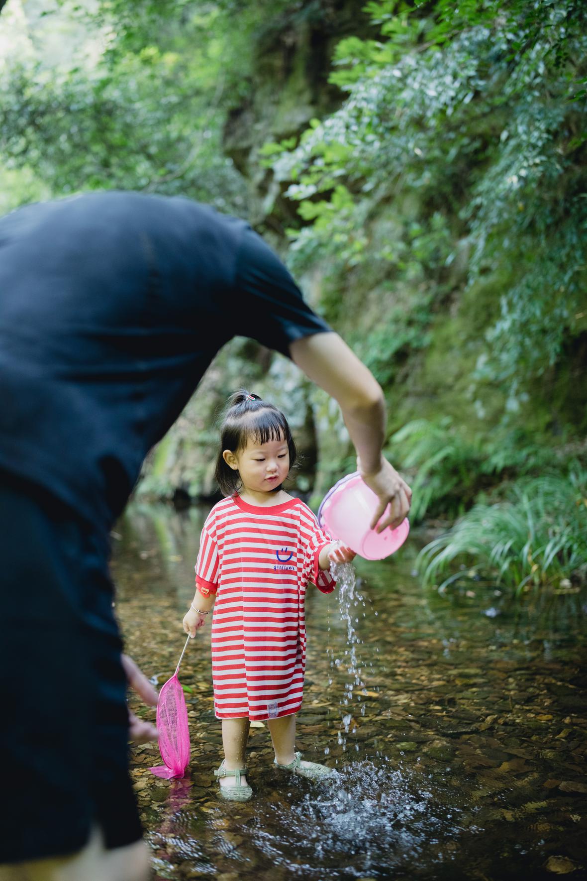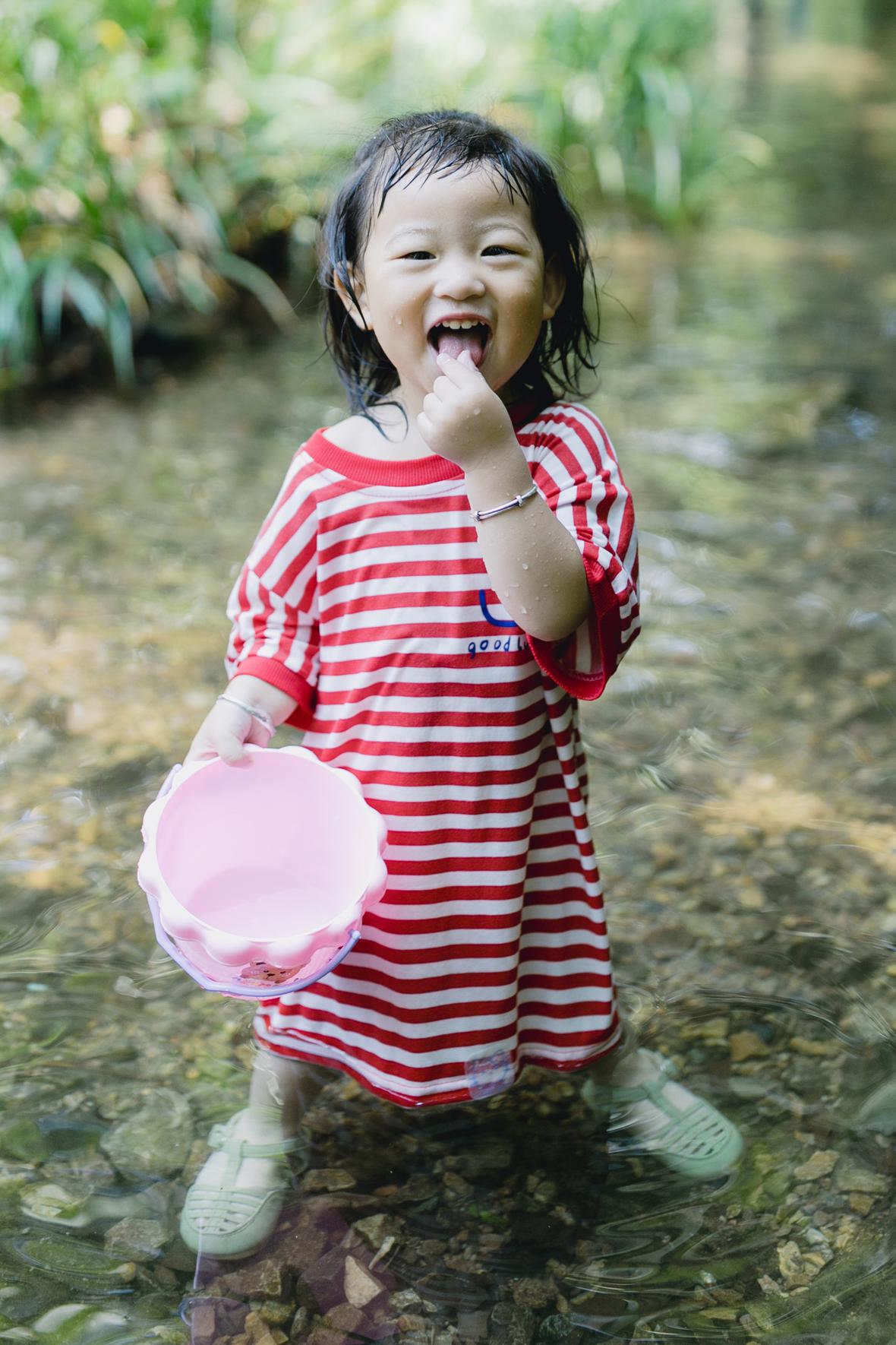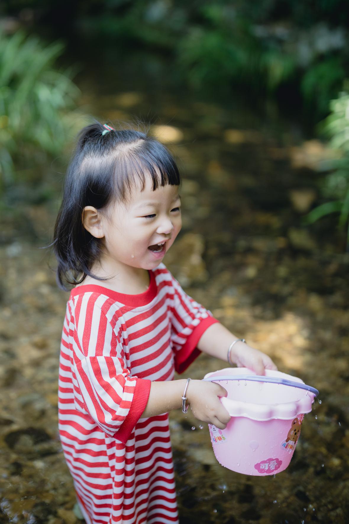对于菲比而言,这是她第一次体验九溪的快乐。仅一只粉色小桶,就让她乐不可支。22个月的她会说“还要玩”“没有鱼”“冰冰凉”“呦呦切克闹”,以及会将打满水的水桶递给新认识的小男孩说“哥哥帮我拿拿”,小奶音,超好玩。