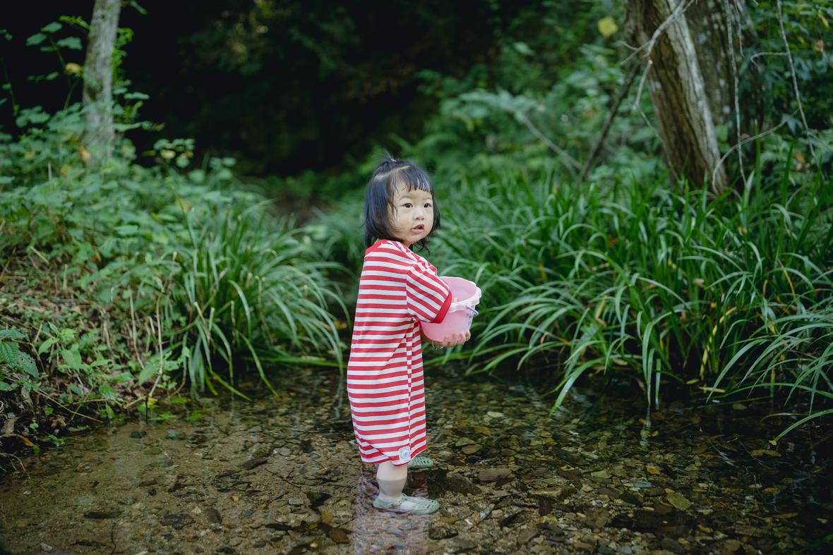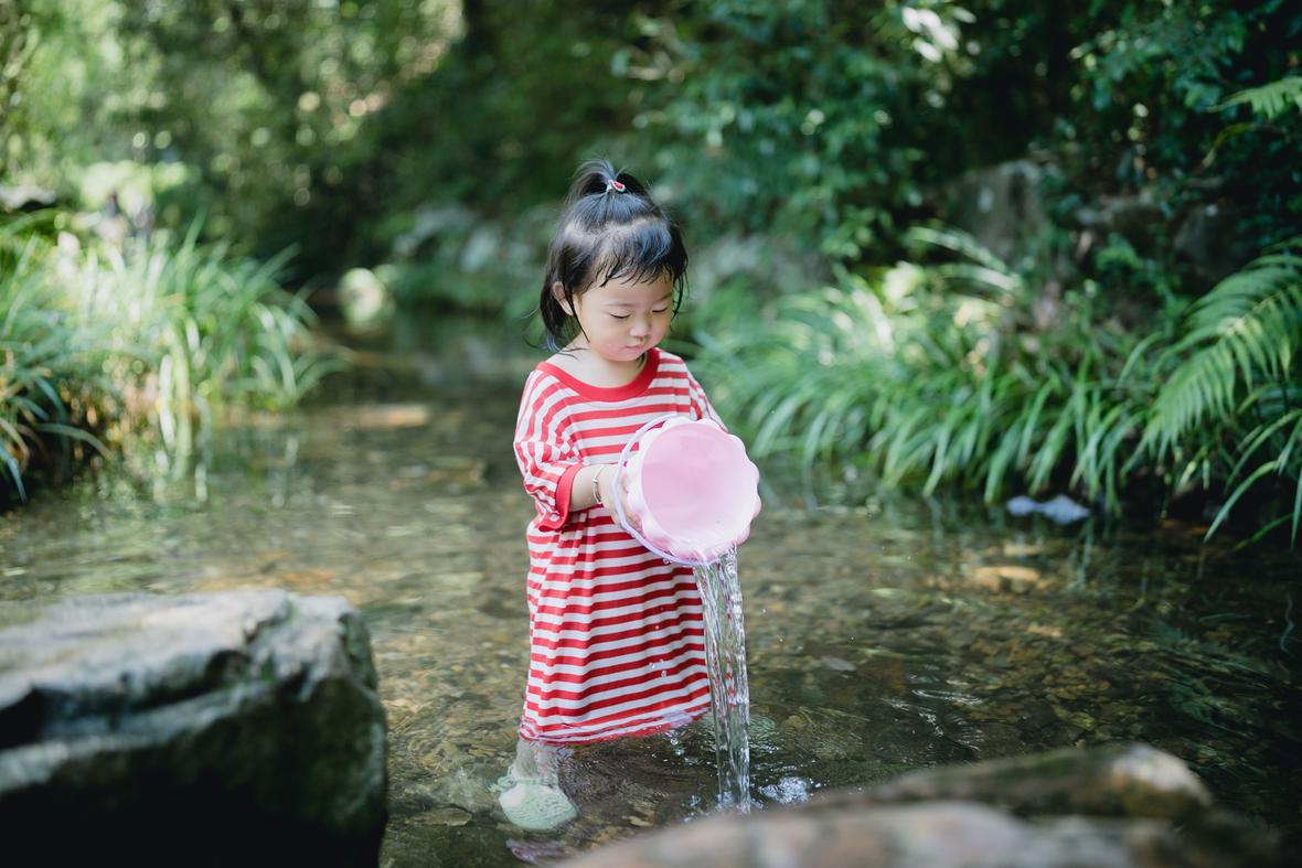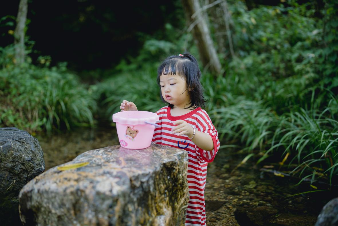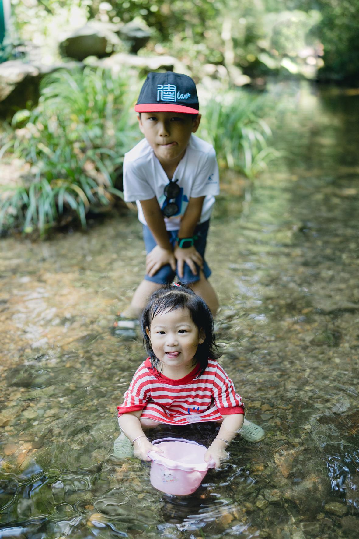 对于菲比而言,这是她第一次体验九溪的快乐。仅一只粉色小桶,就让她乐不可支。22个月的她会说“还要玩”“没有鱼”“冰冰凉”“呦呦切克闹”,以及会将打满水的水桶递给新认识的小男孩说“哥哥帮我拿拿”,小奶音,超好玩。